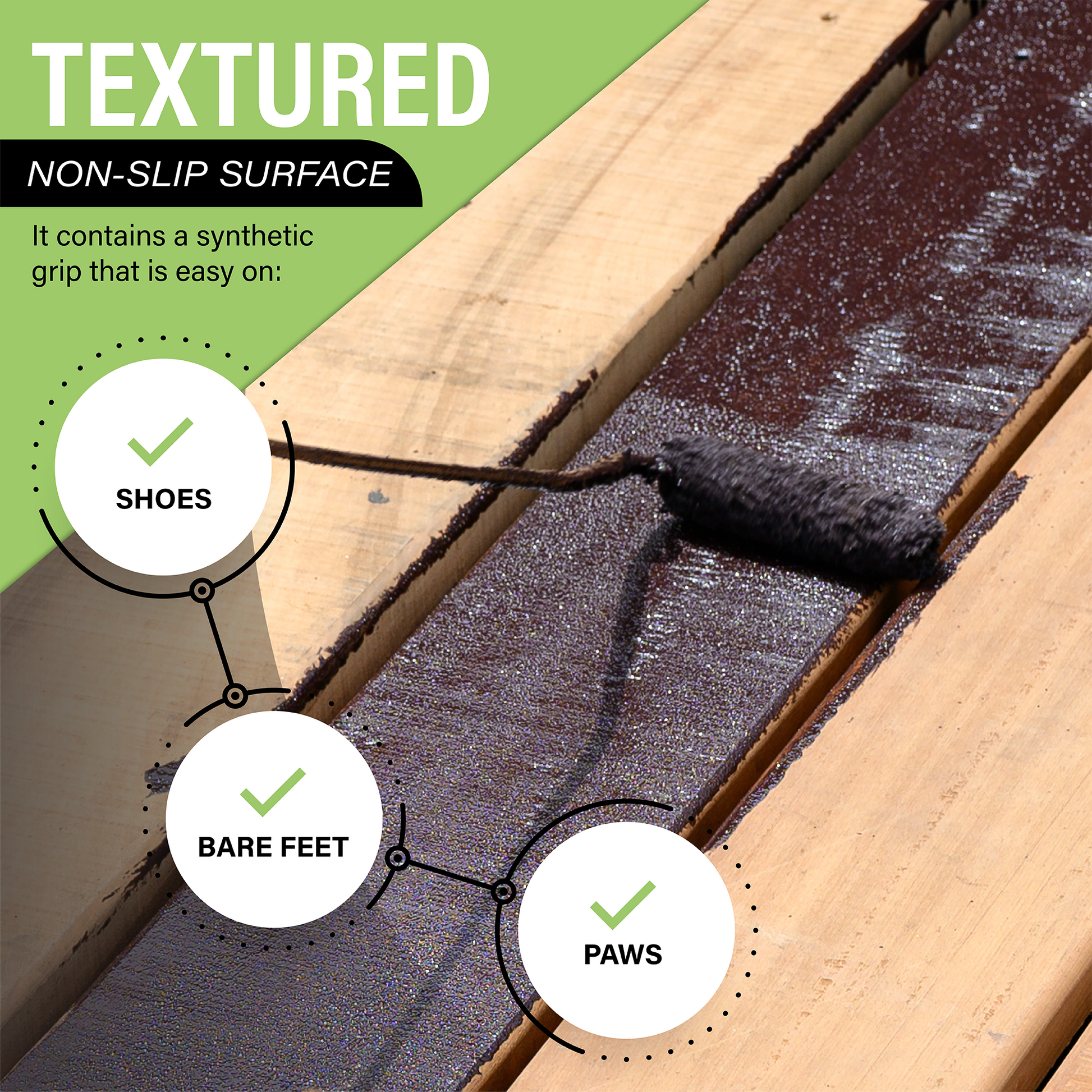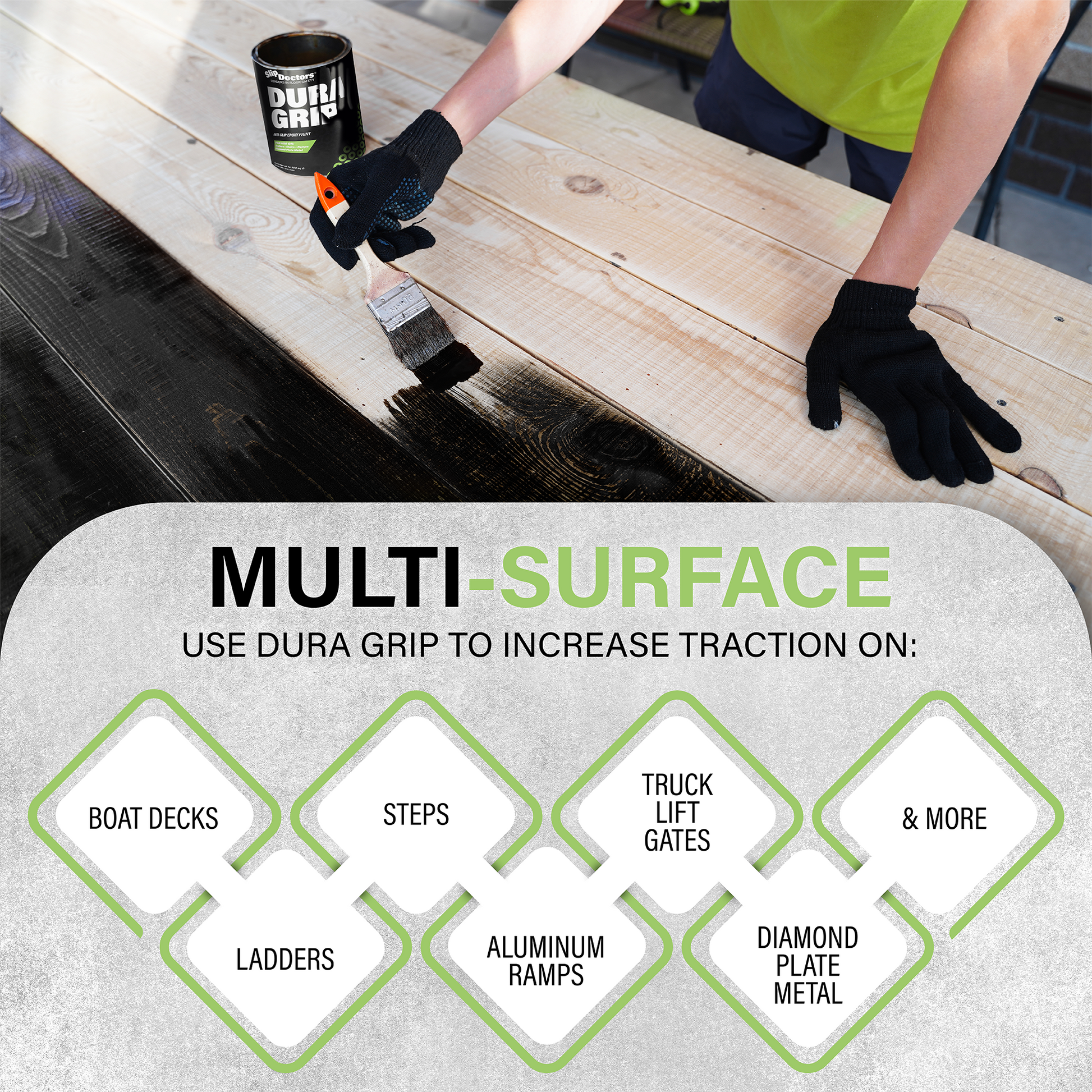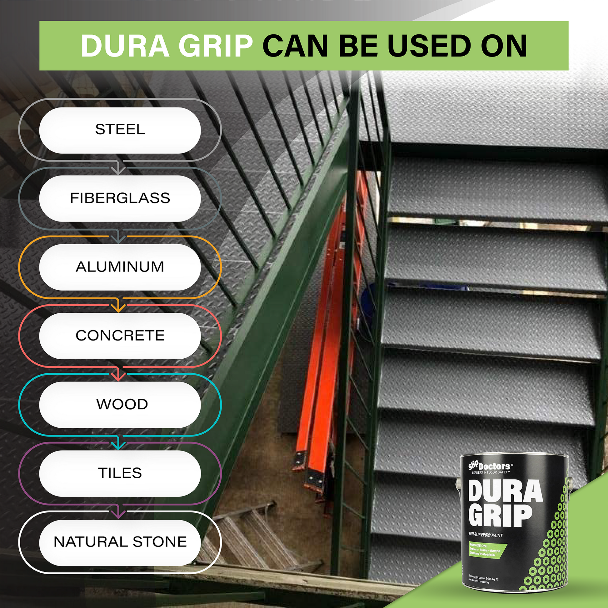 Dura Grip anti-slip paint coatings are designed to prevent slip and falls in your home and business. Built to last, Dura Grip is an extremely tough and durable paint that can be used on multiple types of surfaces including steel, fiberglass, aluminum, concrete, asphalt, painted surfaces, wood, athletic courts, and wood decks. It’s perfect for both indoors or outdoor commercial or residential areas and you can walk comfortably on Dura Grip even with bare feet.