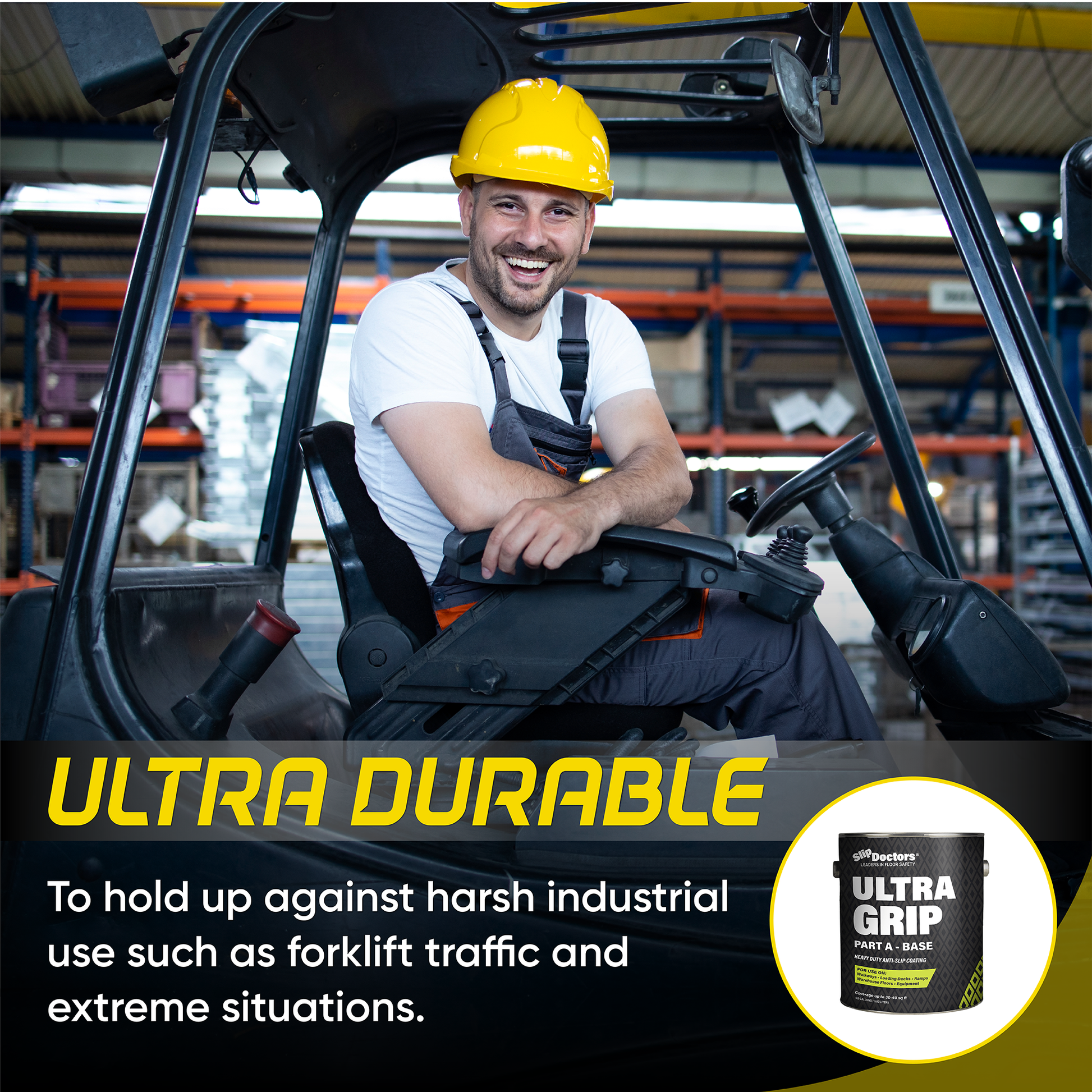 SlipDoctors Ultra Grip is the latest and most aggressive anti-skid paint, with the ultra-rough textured gloss finish composed of a two-part epoxy that gives it extraordinary durability. Ultra Grip’s extreme texture makes it suitable for high traffic surface types like steel, diamond plate, wood, ramps, truck beds and more. Ultra Grip’s two-part epoxy composition makes it especially ideal for industries exposed for harsh chemicals environments. Experience unparalleled resistance and anti-slip safety with Ultra non-skid floor paint available in dark gray, light gray, black, and yellow colors.